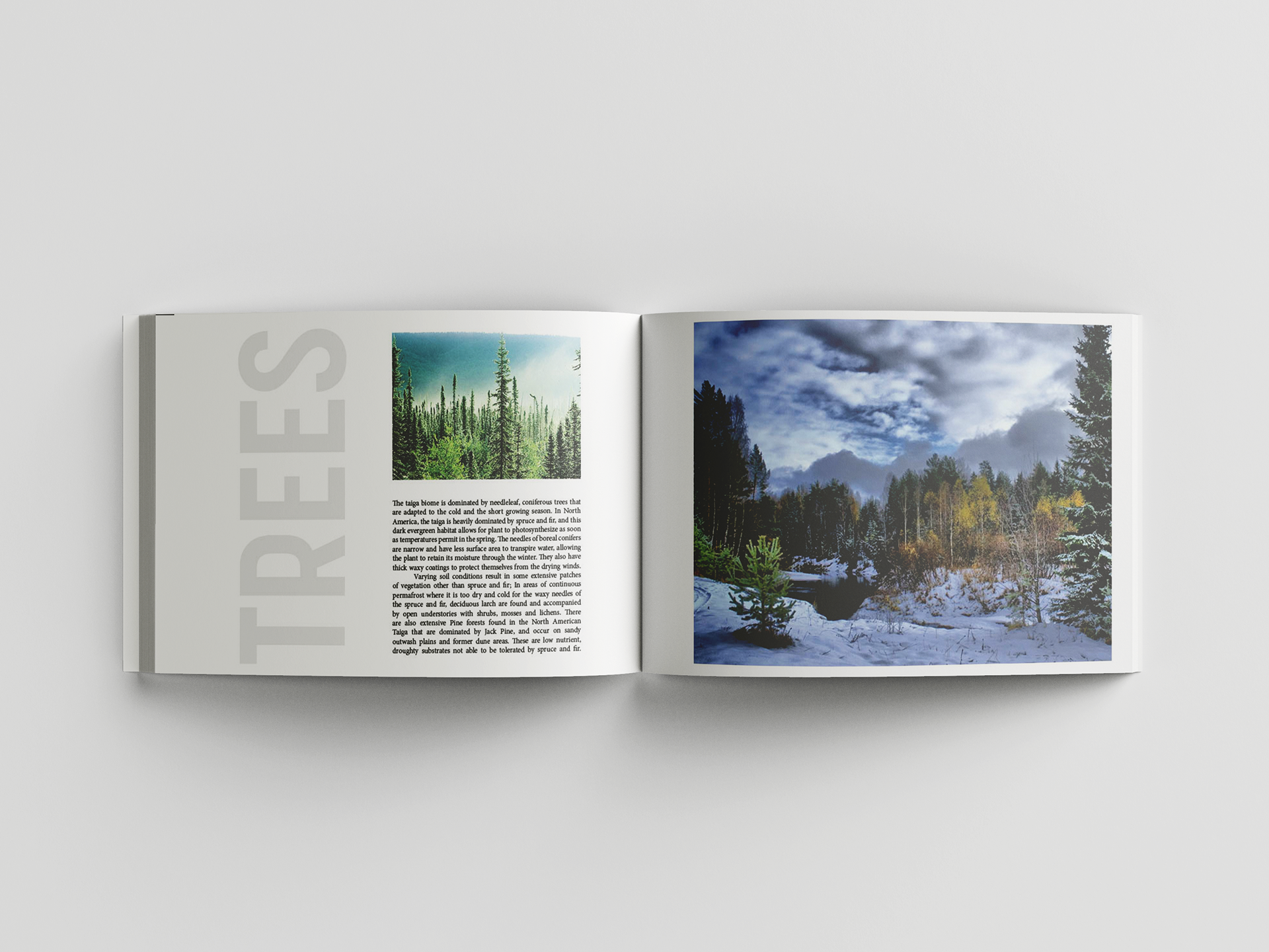 A 12-page scientific overview of what Taiga, North American Boreal Forests are and why they are so important. The book is illustrated from the ground up, first discussing the soil, trees plants, fauna, climate, and conservation efforts. Included are maps to describe the range of these forests, and diagrams to show the soil type and the types of trees found in these biomes. The purpose is to educate people on the importance of this biome and how it plays a role in global warming.