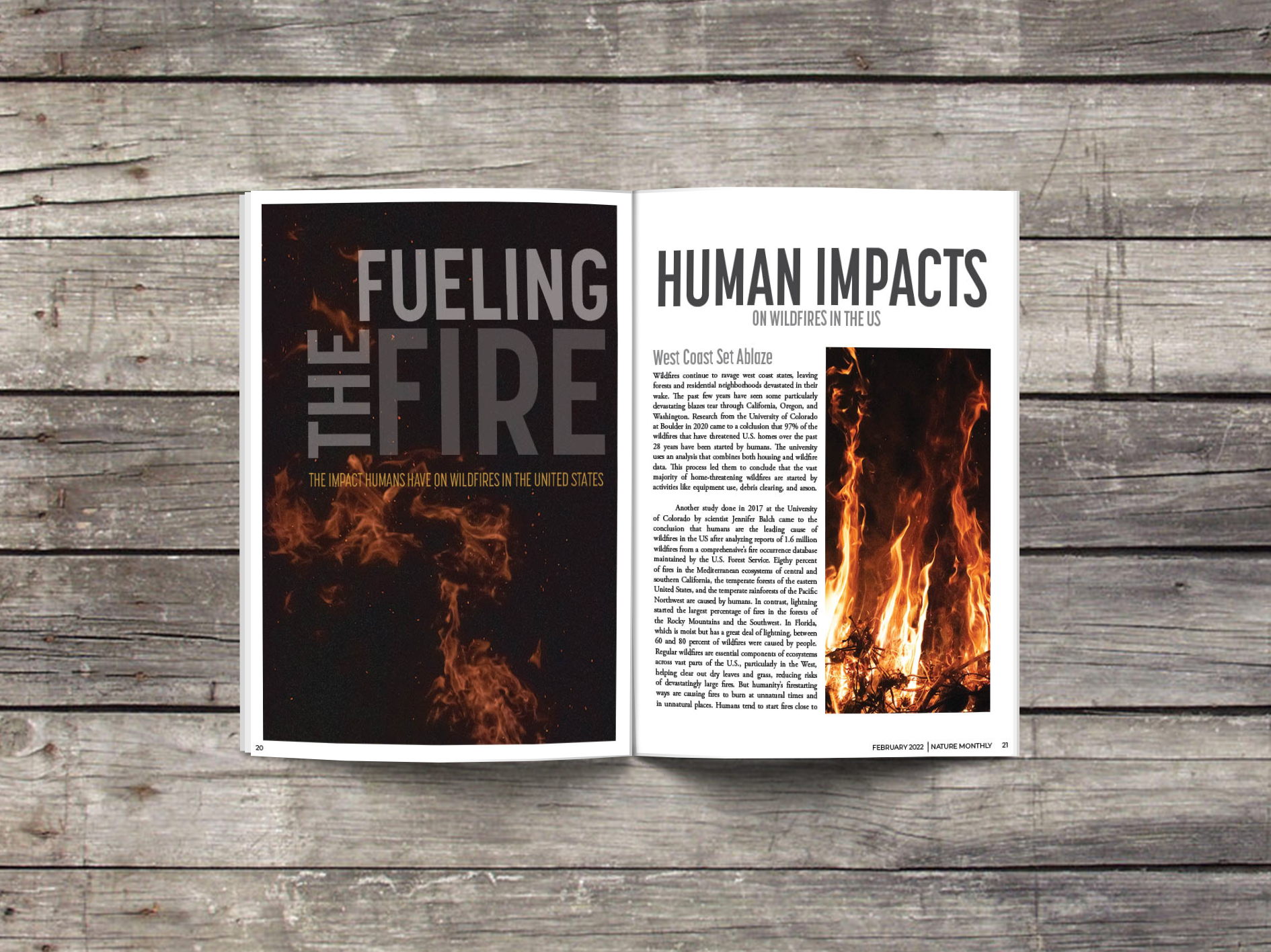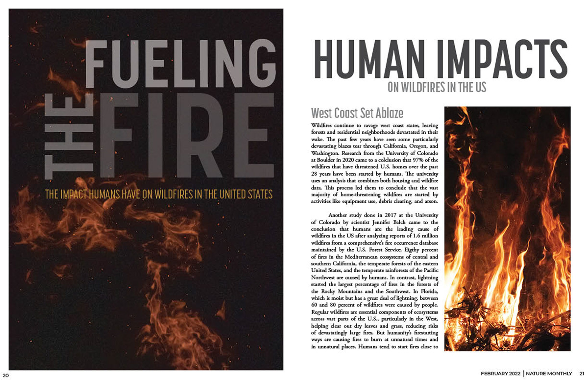 This magazine spread was inspired by a series of photos from my photography collection. I wanted to create an informative article about the impact humans have on wildfires in the United States.